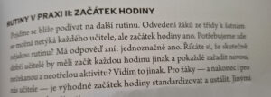 Bobek píše: „Pojďme se blíže podívat na další rutinu. Odvedení žáků ze třídy k šatnám se možná netýká každého učitele, ale začátek hodiny ano. Potřebujeme zde nějakou rutinu? Má odpověď zní: jednoznačně ano. Říkáte si, že skutečně dobří učitelé by měli začít každou hodinu jinak a pokaždé zařadit novou, nečekanou a neotřelou aktivitu? Vidím to jinak. Pro žáky — a nakonec i pro nás učitele — je výhodné začátek hodiny standardizovat a ustálit. Jinými slovy: zavést do něj rutiny… Pokud byste přišli o něco později, řekněme 30 sekund po zvonění, viděli byste každého žáka samostatně a v tichosti pracovat na opakovacích kvadrantech. Tak interně říkám prvnímu úkolu, což jsou čtyři otázky kvízového typu, které slouží k reaktivaci znalostí a dovedností z minulých týdnů, měsíců i let.“