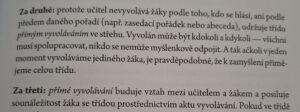 Bobek vyvolává mylný dojem, že vyvolávání buduje vztah a sounáležitost. Přitom Bobkův názor, že přímé vyvolávání „buduje vztah mezi učitelem a žákem a posiluje sounáležitost žáka se třídou“ je pedagogický nesmysl, který zaměňuje kontrolu za zájem a mocenský akt za vztahový akt. Vztah se buduje jinak, nikoli řízenou interakcí, v níž učitel rozhoduje, kdo a kdy bude stručně odpovídat. Opravdové vztahy ve třídě vznikají skrze autenticitu, bezpečí, sdílení a dialog, ne prostřednictvím vyvolávání na podporu centrálního a šéfovského statusu učitele. V podobných pasážích je velmi viditelná Bobkova neodbornost a neznalost základů pedagogické a sociální psychologie. Hází pojmy a vymýšlí procesy, které s realitou nemají nic společného. Je to jeho specialita – driluje děti, sedící bez hnutí v lavici, to mu podle jeho mínění „funguje“, takže by měli drilovat žáky v roli figurín všichni učitelé. A k tomu nám přidá pasáž na hlavu postavené pseudopsychologie, které (pamatujete si jeho prosebný úvod o shovívavost nad svou neodborností?) vůbec nerozumí. Příkladů jeho laického primitivismu je v knize jako much. Například je v textu zmíněna strategie, kdy učitel „zvedne sebevědomí žáka tím, že ho vyvolá, když ví, že odpověď zná“. To je manipulativní konstrukce: skutečné sebevědomí nevzniká na základě řízeného potvrzení autoritou, ale na základě přijetí, důvěry a možnosti se projevit i bez dokonalosti a „správnosti“. Představa, že „vyvolání“ je výrazem důvěry a začlenění, je popřením rovnosti v komunikaci – vždyť učitel má v ruce moc nechat žáka mluvit i mlčet, vyvolat i nechat být. To není cesta k vztahové symetrii, ale její pravý opak. Je naopak velmi smutné, když si učitel myslí, že sebevědomí žáka stojí na jeho potvrzení správnosti žákovi odpovědi. Shrnuto: přímé vyvolávání je metodicky slabé, psychologicky problematické a pedagogicky nepřesvědčivé. Nevede k lepšímu učení, ale jen k větší kontrole, upevněné centralizovanou mocí učitele. A pokud někdo považuje kázeňský režim za cíl výuky, je načase se ptát, komu a čemu ta výuka skutečně slouží. Můžete jít do skupiny Učitelé+, tam je takových zastánců moci a represí jako sladkých jablek.