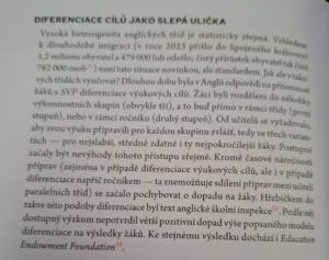 Bobek píše: „Vysoká heterogenita anglických tříd je statisticky zřejmá. Vzhledem k dlouhodobé imigraci (v roce 2023 přišlo do Spojeného království 1,2 milionu obyvatel a 479 000 lidí odešlo; čistý přírůstek obyvatel tak činil 782 000 osob) není tato situace novinkou, ale standardem. Jak ale v takových třídách vyučovat? Dlouhou dobu byla v Anglii odpovědí na přítomnost žáků s SVP diferenciace výukových cílů. Žáci byli rozděleni do několika výkonnostních skupin (obvykle tři), a to buď přímo v rámci třídy (první stupeň), nebo v rámci ročníku (druhý stupeň). Od učitelů se vyžadovalo, aby svou výuku připravili pro každou skupinu zvlášť, tedy ve třech variantách – pro nejslabší, středně zdatné i ty nejpokročilejší žáky. Postupně začaly být nevýhody tohoto přístupu zřejmé. Kromě časové náročnosti přípravy (zejména v případě diferenciace výukových cílů, ale i v případě diferenciace například ročníkové) tazemožňují slabší přípravy méně učitelů paralelně sledovat a zacíleně pochybovat o dopadu na žáky. Hřebíčkem do rakve této podoby diferenciace byl text anglické školní inspekce. Podle něj dostupný výzkum nepotvrdil větší pozitivní dopad výše popsaného modelu diferenciace na výsledky žáků. Ke stejnému výsledku dochází i Education Endowment Foundation. Přístup, který jsem v Anglii zažil já a který je považován za nejlepší aktuální praxi, spočívá v podchycení maxima žáků se speciálními vzdělávacími potřebami v rámci univerzální výuky pro třídu jako celek. Výuka vedená v souladu s tím, jak byla dosud popsána v této knize, je inkluzivní. Umožňuje maximu žáků, i těm s SVP, dosáhnout očekávaných výukových cílů i ve standardní podobě výuky.“