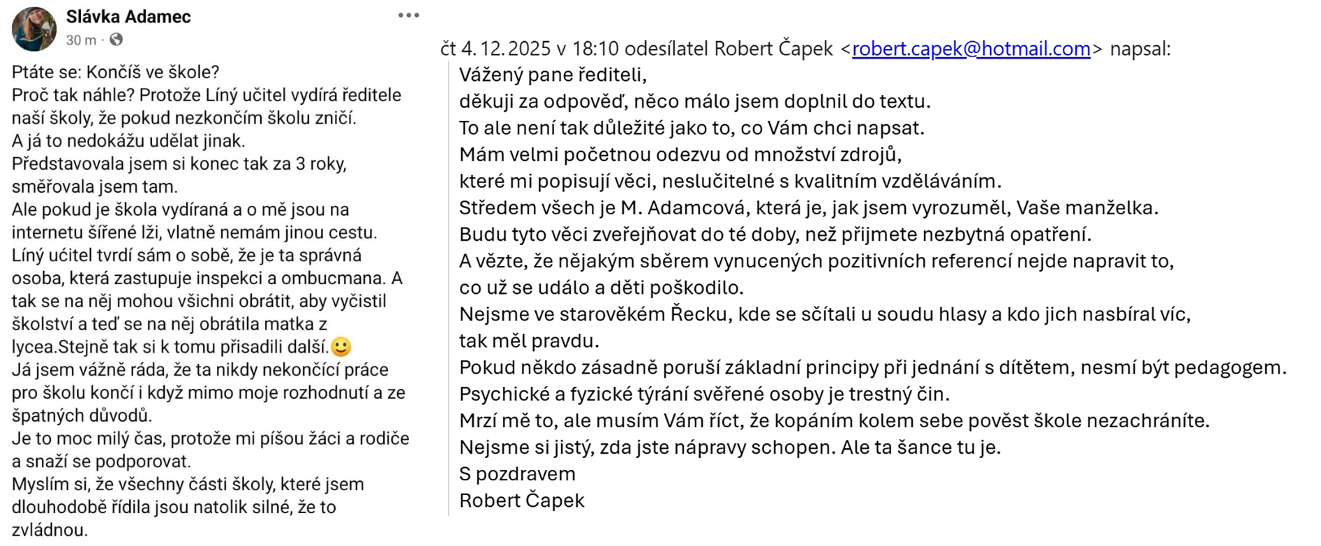 Líný učitel: Škola Heřmánek viditelně není respektující a bezpečné prostředí, ale pracoviště s výrazně narušeným psychosociálním klimatem a selhávající kulturou vedení. Chování ředitelky je prudké, nevyzpytatelné a hrubě nerespektující osobní integritu zaměstnance i jeho rodiny. To ukazuje na vysoce problematický styl řízení, plného invazivního chování, v němž se výkon autority opírá o ponižování, verbální agresi a zastrašování, nikoli o odbornou argumentaci a partnerskou komunikaci. V rovině pedagogické jde navíc o modelování nevhodných vzorců chování přímo před dětmi: žáci vidí dospělého ve vedoucí pozici, který křikem a tlakem prosazuje svou vůli, což podkopává jakoukoli snahu školy budovat kulturu respektu, dialogu a bezpečí. Opakované zásahy do osobních hranic (noční telefonáty během prázdnin, chaotické a úzkost vyvolávající SMS, zpochybňování již schválené dovolené) u zaměstnance vedou k trvalému pocitu nejistoty, ohrožení a ztráty kontroly nad vlastním pracovním i osobním prostorem. V kombinaci s „ohýbáním reality“ (tvrdí se opak toho, co je doloženo v systému) a neustálým očekáváním, „co ji rozčílí tentokrát“, se před námi rýsuje prostředí s rysy dlouhodobého psychického tlaku a zdraví ohrožujícího mobbingu, v němž pracovník musí být permanentně ve střehu. Svědčí to o zásadním selhání v oblasti bezpečného pracovního prostředí, profesní etiky i péče o duševní zdraví zaměstnanců, a legitimně vyvstává otázka, zda je takto vedená instituce schopna naplňovat deklarované principy respektujícího vzdělávání. Je myslím jasné, že za přítomnosti M. Adamcové nikoliv. Kdybyste si přečetli, co M. Adamcová píše o svém odchodu ze školy (na obrázku), tak byste měli pocit, že to konečně pochopila. Ale to je jen její hra, kterou předvádí několikrát do roka: odejdu, odejdu… Ano, prosím, škole by to nesmírně pomohlo! A také žádné maniacké telefonáty, žádné výhrůžné zprávy, prostě nic! Ale nebyla by to Adamcová, aby ze sebe nedělala oběť. Každý může posoudit, jak je pravdivé její tvrzení: „Protože Líný učitel vydírá ředitele naší školy, že pokud neskončím školu zničí.“ Na obrázku dávám celý Adamcové výplod a moji korespondenci s ředitelem školy.