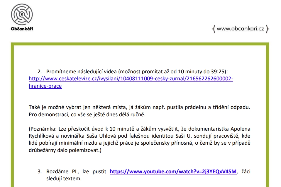 Mnoho oněch „inspirací“ ani neskrývá, že bylo na web nahrnuto z různých jiných grantů a projektů. Některé se úplně vymykají reálnému využití (jako například „Agent Kix“), jiné mnohokrát recyklují jeden jediný nápad („Setkání s knihou“ nebo „Výjimeční sportovci“). Když už, tak měly být jako ukázka v jednom exempláři, ale ne, musí se to recyklovat do zblbnutí. Českému učiteli totiž nestačí ukázat aktivitu s jednou knihou a s jedním sportovcem. Musí tam být deset knih a pět sportovců, asi byli tvůrci placeni od kusu. Pak se ale divím, že tam není celá fotbalová jedenáctka. Pak tu máme třeba náměty „Transatlantický obchod„, který obsahuje jen jedno pdf, na kterém je strana 22 a 23 z nějaké učebnice a nic víc. WTF? „Měšťané, obchod a otroctví v 18. století“ jsou bez čehokoliv jiného zase jen strany učebnice, tentokrát 14 – 17. Díky, ale nebylo by lepší nekouskovat tu učebnici takhle hloupě? Něco k ní připsat? Jsou tu i témata, která nejenže nevedou k žádné činnosti v hodině („Stres a jak s ním pracovat„), některé z nich jsou ještě navíc i tematicky úplně mimo (například „Sociologický průzkum třídy„). Lepší standard mají věci od pana Pinkase a dalších dějepisců, které bohužel opakovaně prezentují to, jak si tihle pánové představují badatelskou výuku: stokrát a přitom stále stejně. Ošklivá bradavice na kráse je to, že jejich věci byly vytvořeny už v roce 2022, tedy jsou dost těžko aktuální k novému RVP, že? Další přípravy zase viditelně ukazují, že byly vytvořeny od stolu. Obsahují nesmyslné úkoly, které je třeba splnit s nereálnou časovou dotací, vše úplně vycucané z prstu. Mrkněte na ukázku toho, co vše je třeba zvládnout za 5 minut… a jak jinak, než řízenou diskuzí? Ale alespoň to už vypadá jako nějaká příprava! Takových je tam ale jen několik, v podobné „kvalitě“.