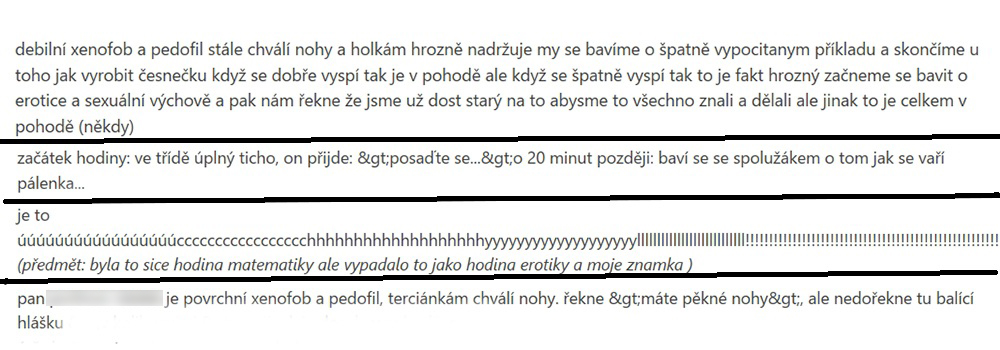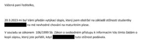 danému učiteli totožnost žákyně, která podala stížnost. To je naprosto nevhodné, protože v té době byl učitel P. stále ještě zaměstnanec školy a mohl žákyni zastrašovat, ovlivňovat nebo se ji mstít. Důkazem této skutečnosti je dopis od učitele P. směrem k vedení školy, kde danou žákyni jmenoval.